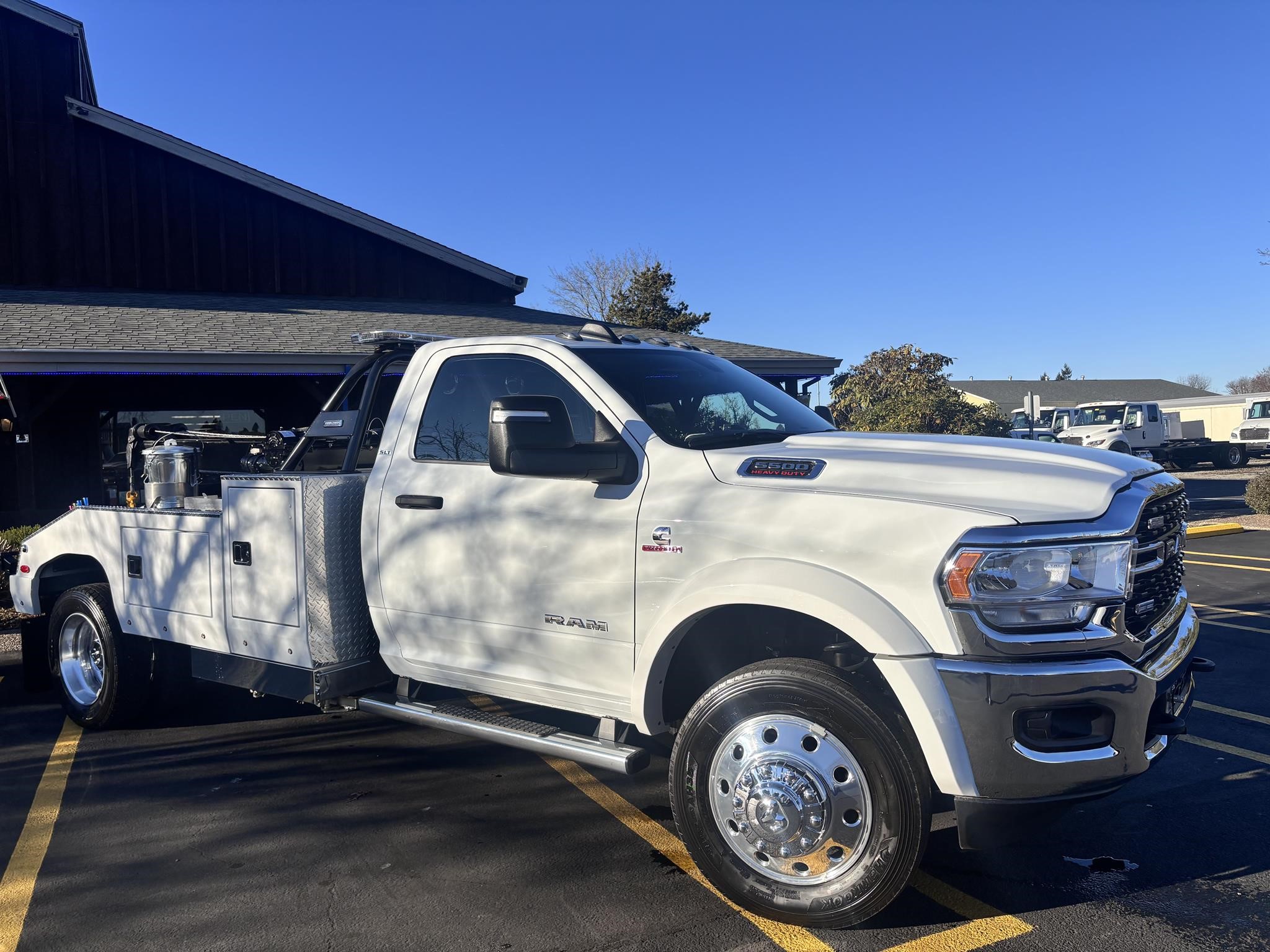 RAM 5500 SLT Reg Cab w/ Cummins 6.7L I-6 OHV Direct Diesel Injection, 24 Valve Intercooled Turbo, 325HP @ 3,000 rpm, 750 lb-ft @ 1,600 rpm, 136 amp Alternator, 6 Speed Automatic Aisin AS68RC, Exhaust brake. Engine Block Heater, 120" CA, 4 Wheel Disc Brakes w/ Front and rear Vented Discs, Non-Independent Front Suspension, Rear Leaf Suspension, 4 Wheel Anti-Lock Braking System, Daytime Running Lights, Dual Air Bags, A/C, 5" Touch Screen AM/FM/CD Radio, Cruise Control, Power Windows, Power Door Locks, 40-20-40 Split Bench Seat, Vinyl Black Material, Upfitter Switches (5). 19,500 GVWR, Chrome Cab Steps, 22 Gal Fuel Tank, 225/70R19.5 Tires w/ 19.5 Aluminum wheels 4x4 Package Transfer case Skid plate shield, shift on the fly, Block heater.