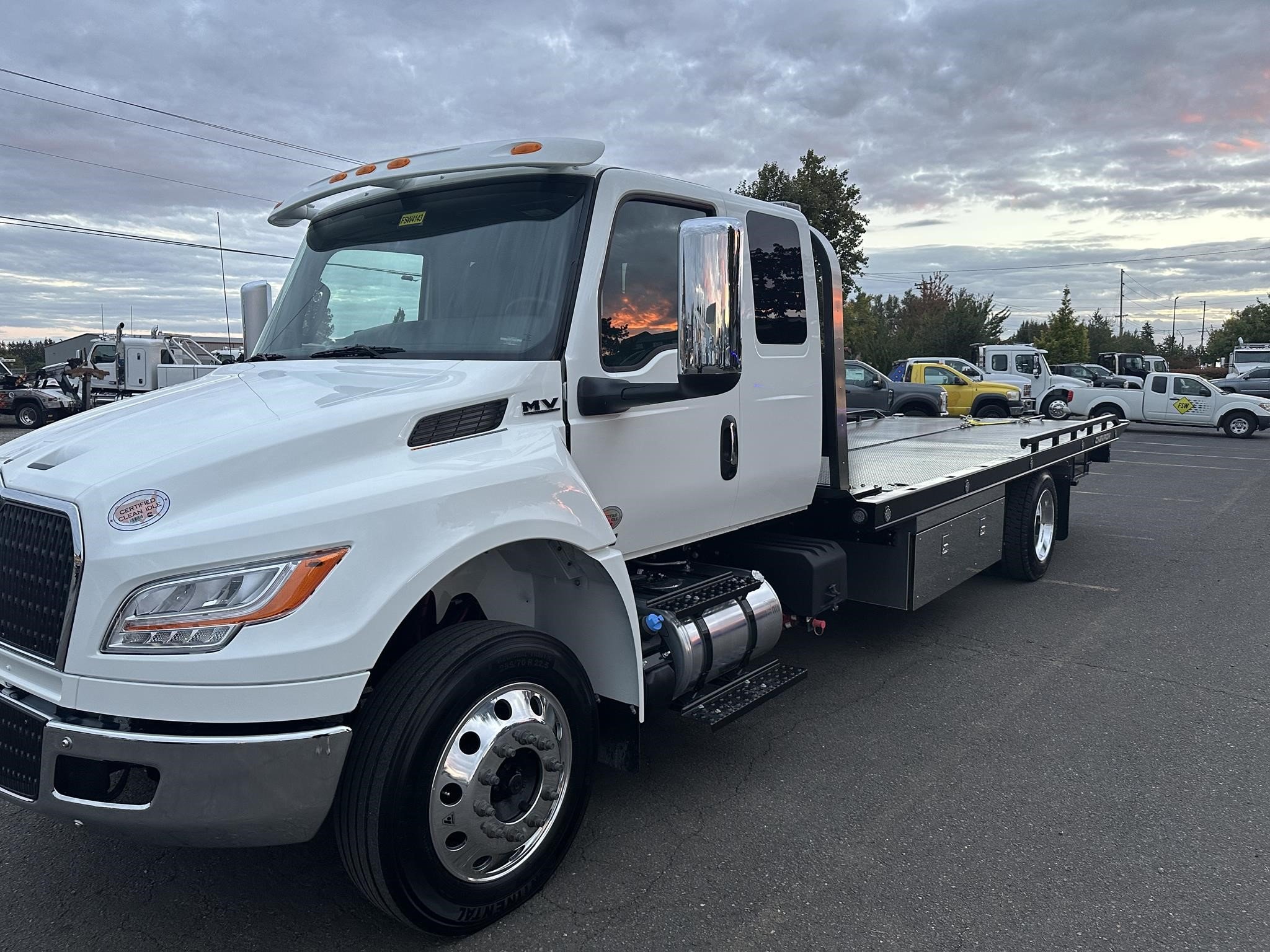 International Model MV Extended cab. Cummins ISB 6.7L, 260HP @ 2,300 rpm, 660 lb-ft @ 1,600 rpm, Allison RDS-2200 6 Speed Auto, Air Brakes, Air Dryer Heater, Exhaust Brake, Front Axle: Dana-Spicer I-Beam 8,000lb w/ Shock Absorbers, Rear Axle: Dana-Spicer 19,000lb rear differential lock. , 20,000lb Air Ride Suspension, 4.88 Rear Axle Ratio, Chrome Bumper, black Grille, Air Ride Driver Seat,& Passenger Seat, rear bench seat. Idle Up, Cruise Control, Tilt-Wheel, AM/FM/CD/MP3 w/ Bluetooth, Air Horn, Engine Block Heater, Dual 40-50 Gal Alum Fuel Tanks, 7 Gal DEF Tank, Power Windows, Power Door Locks, Power heated Mirrors. A/C, 255/70R22.5 Tires w/ 22.5 Alum Wheels, Cup holders.Visor 25,500 GVWR,