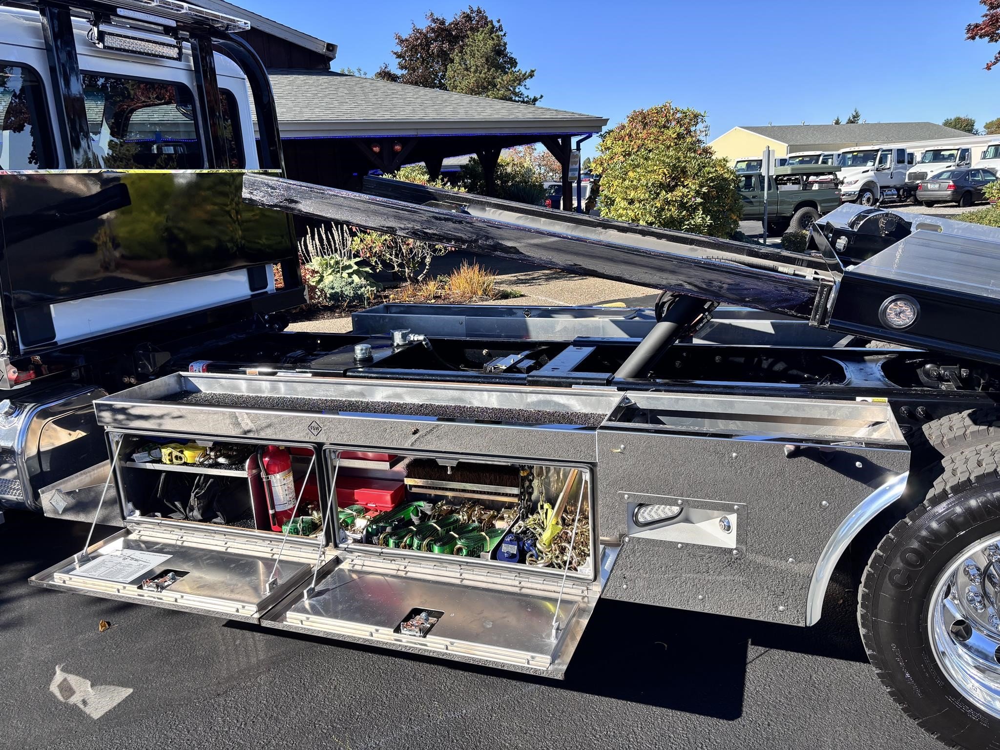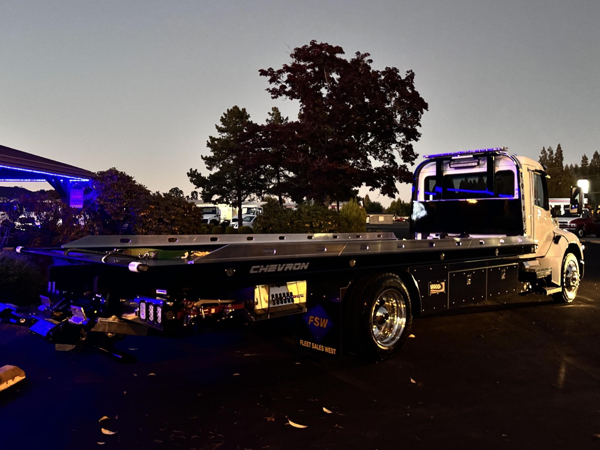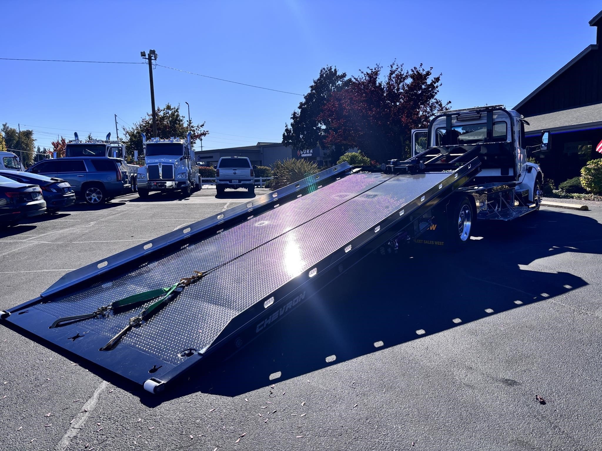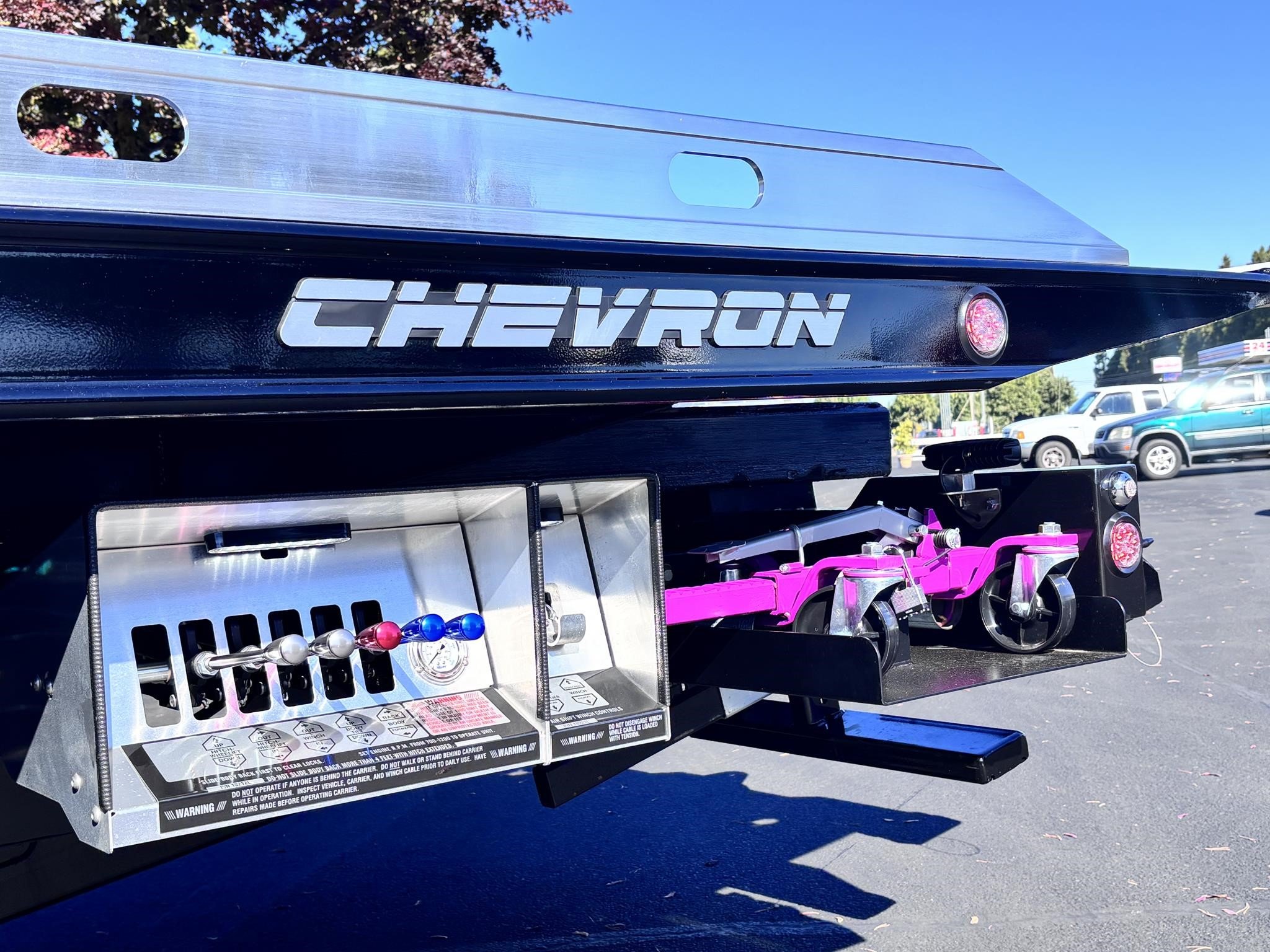 Chevron 21.5' Steel LCG (Low Center of Gravity) Carrier w/ Wheel Lift, 3/16 Deck Plate, 3x2 Corten Tube Crossmembers on 8 inch Centers, (4) Rear Chain Locks, (2) Front Chain Locks, (6) Floor Plate Chain Locks (3 per side), 8,000lb Worm Gear Winch, 3/8" x 50' Winch Cable, Illuminated Dual Controls, FMVSS 108 Lamp Group Shock Mounted Lighted, Direct Mount Pump, Cable Roller Guide w/ Tensioner, Winch Free Spool Extension, Back-Up Alarm, (2) Safety Chains, Mechanical Anti-tilt, Black Body Paint, 102" Wide Body, Inboard Tilt Cylinders, Floor Level Roll Formed w/ Punched Stake Pockets, 4,000lb Wheel Lift w/ Releasable L Arms, Fully Hydraulic Wheel Lift, (2) Safety Straps & Ratchets, (2) Rear Safety Chains, Body Lock w/ Nylatron Roller Bearings, & 12,000lb Deck Load Rating. Body Serial#