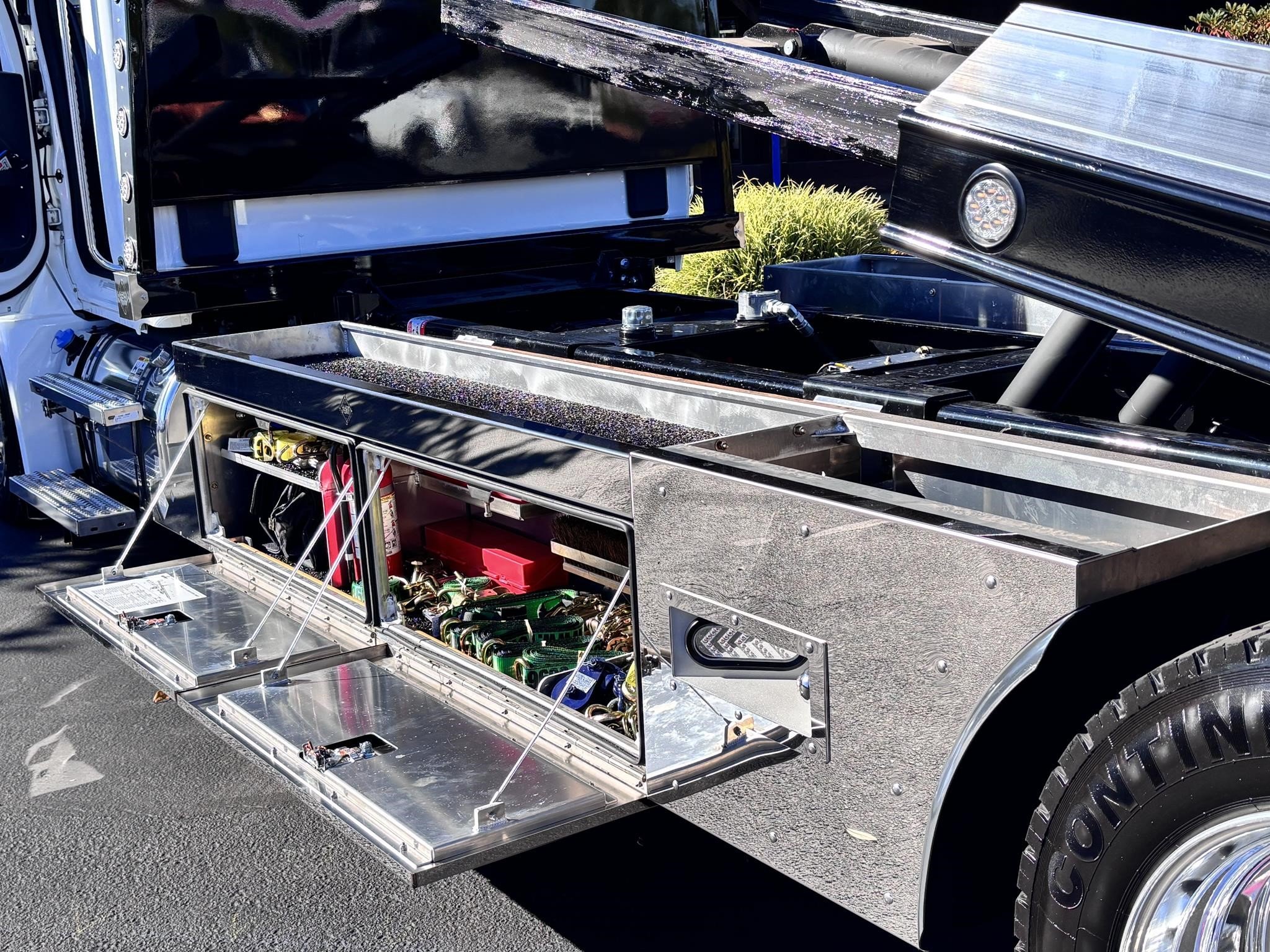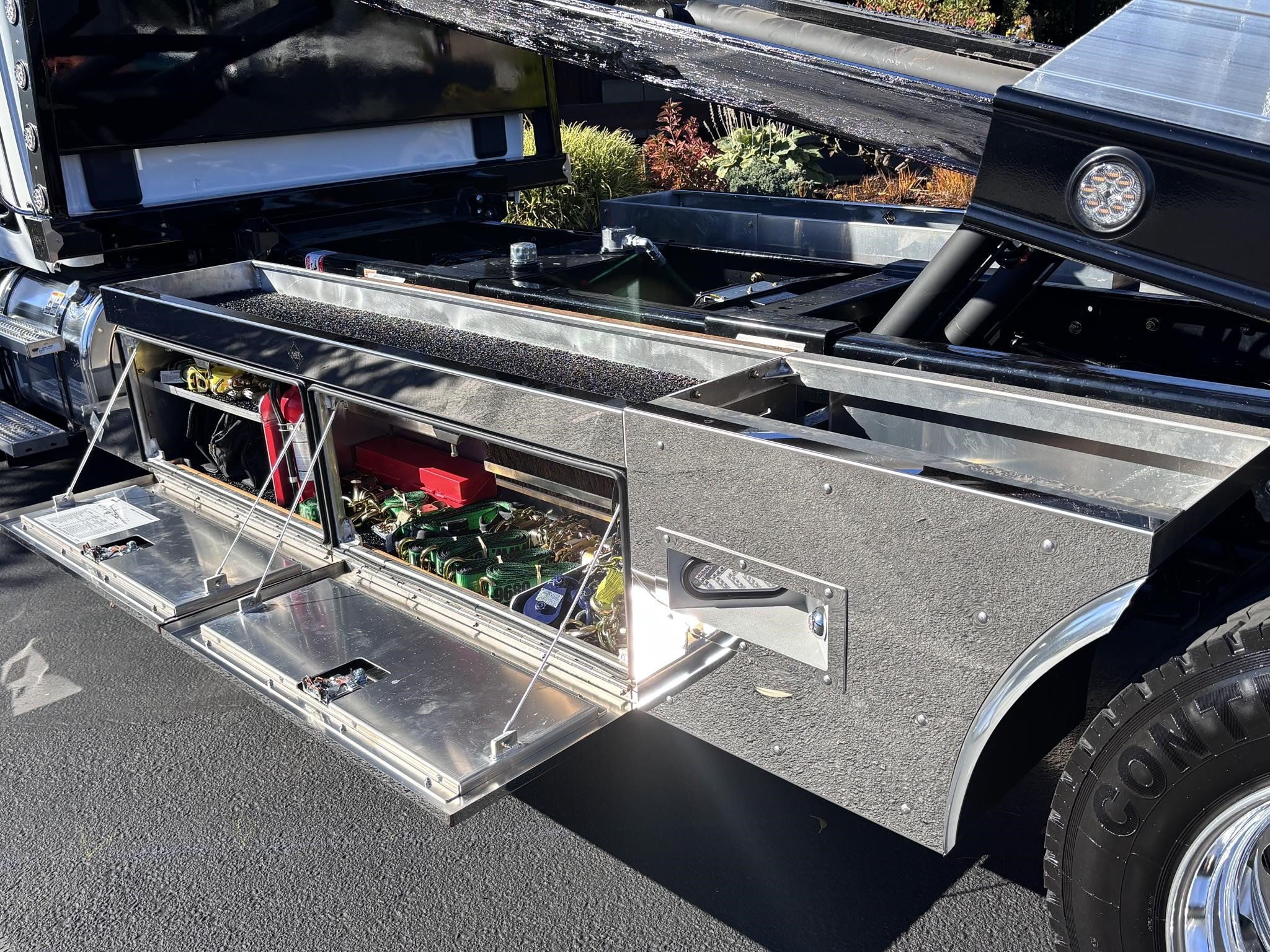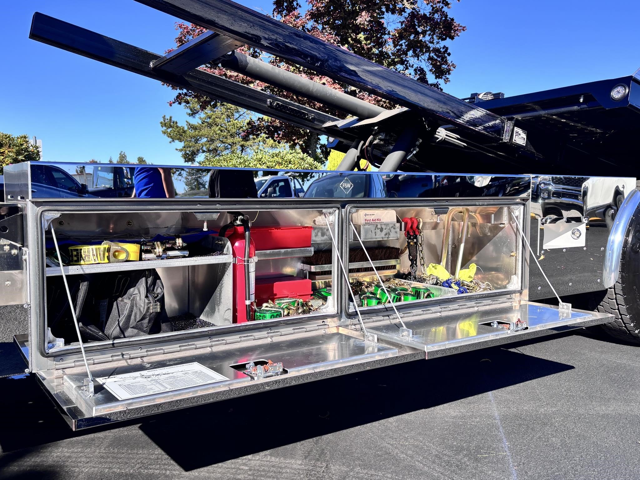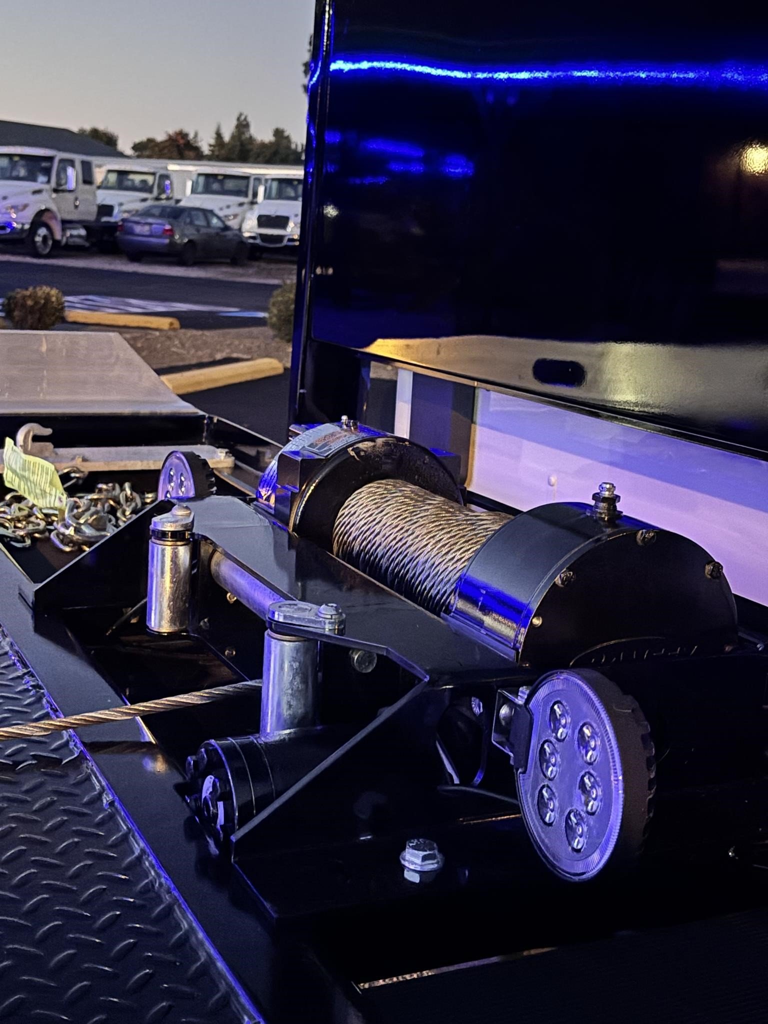 Chevron 21.5' Steel LCG (Low Center of Gravity) Carrier w/ Wheel Lift, 3/16 Deck Plate, 3x2 Corten Tube Crossmembers on 8 inch Centers, (4) Rear Chain Locks, (2) Front Chain Locks, (6) Floor Plate Chain Locks (3 per side), 8,000lb Worm Gear Winch, 3/8" x 50' Winch Cable, Illuminated Dual Controls, FMVSS 108 Lamp Group Shock Mounted Lighted, Direct Mount Pump, Cable Roller Guide w/ Tensioner, Winch Free Spool Extension, Back-Up Alarm, (2) Safety Chains, Mechanical Anti-tilt, Black Body Paint, 102" Wide Body, Inboard Tilt Cylinders, Floor Level Roll Formed w/ Punched Stake Pockets, 4,000lb Wheel Lift w/ Releasable L Arms, Fully Hydraulic Wheel Lift, (2) Safety Straps & Ratchets, (2) Rear Safety Chains, Body Lock w/ Nylatron Roller Bearings, & 12,000lb Deck Load Rating. Body Serial#
