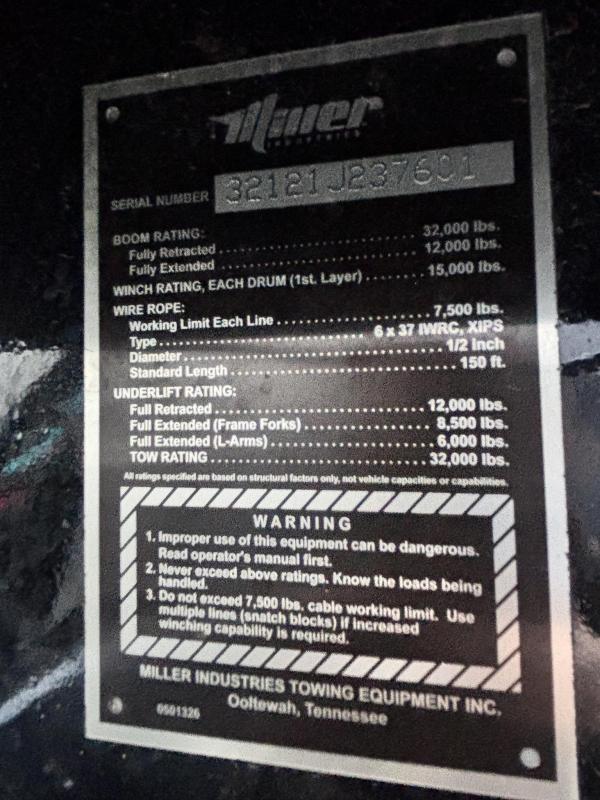 350HP ISL 9 350HP Cummins Allison automatic RDS 3000 six speed. air brake air ride C-brake’ 133’ CA tractor package, aluminum wheels 10k front axle 23,000lb rear axle. 23k Air ride with dump. Visor, chrome 3-piece bumper. Chrome grille, air ride driver seat, Cordura cloth. Locking rear Diff. Tractor package. LED POD headlights. 33,000 GVWR 134” CACentury 3212 High body 84" Body BOOM SPECIFICATIONS; Retracted32,000 lbs.; Extended 12,000 lbs. ; Maximum Angle36° Maximum Hook Height160" Maximum Reach past Tailboard at 30°54" UNDERLIFT SPECIFICATIONS; Fully Retracted (with Forks)12,000 lbs. Fully Extended (with Forks)8,500 lbs. Extended or Retracted with L-Arms 6,000 lbs. Underlift Reach to the Center of Fork Holder. At Normal Tow Position84" Positive Tilt20° Negative Tilt10° Tow Rating32,000 lbs. WINCH RATING & CABLE Rating (first layer of drum) each Winch15,000 lbs. Diameter and Length (each winch)1/2" x 150' Type6 x 37 IWRC STANDARD FEATURES 84" Aluminum (LOW PROFILE CX Body) Modular Body. wtih 3 Compartments Per SideLanyard Controls for Underlift & Boom. on the Passenger Side Manual Control Station on the Drivers SideChrome Double Action Latches. Dual Hydraulic Pump3 Sets of Lift Forks. Hydraulic Rear Jacks with Flipper FeetRubber Fenderetts. 6,000 lb. L-Arms with Pivoting ReceiversSafety Chains, Door ClosuresTailboard "D" Rings, LED Tool, Compartment LightingFederal Standard 108 Lighting, Cable TiebacksLED Taillights, Mud Flaps Body Serial # 32121J237601