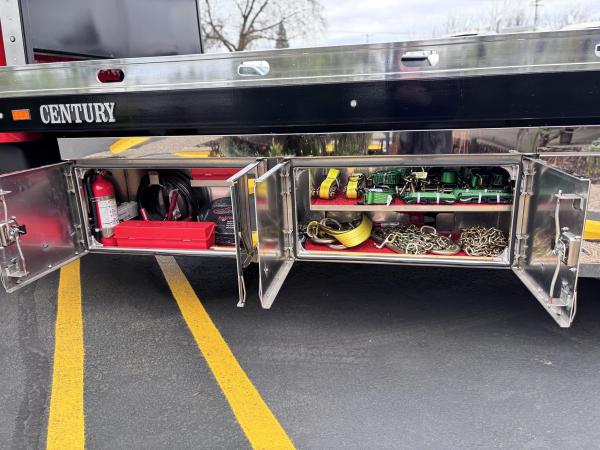 21.6 Century Steel LCG (Low Center of Gravity) Carrier w/ Wheel Lift, 3/16 Deck Plate, 3x2 Corten Tube Crossmembers on 8 inch Centers, (4) Rear Chain Locks, (2) Front Chain Locks, (6) Floor Plate Chain Locks (3 per side), 8,000lb Worm Gear Winch, 3/8" x 50' Winch Cable, Illuminated Dual Controls, FMVSS 108 Lamp Group Shock Mounted Lighted, Direct Mount Pump, Cable Roller Guide w/ Tensioner, Winch Free Spool Extension, Back-Up Alarm, (2) Safety Chains, Mechanical Anti-tilt, Black Body Paint, 102" Wide Body, Inboard Tilt Cylinders, Floor Level Roll Formed w/ Punched Stake Pockets, 4,000lb Wheel Lift w/ Releasable L Arms, Fully Hydraulic Wheel Lift, (2) Safety Straps & Ratchets, (2) Rear Safety Chains, Body Lock w/ Nylatron Roller Bearings, & 12,000lb Deck Load Rating. Body Serial# ST12L2A240036