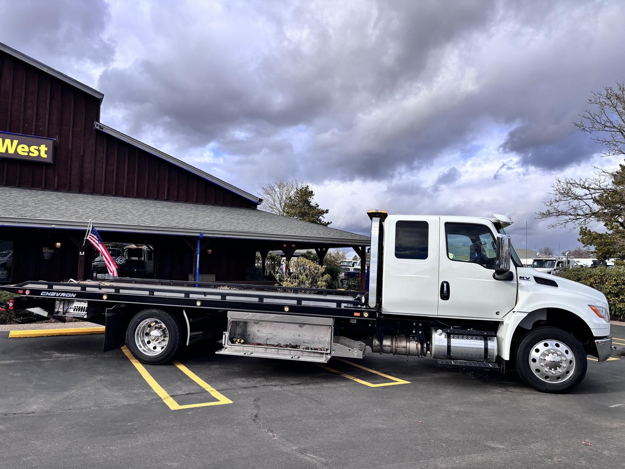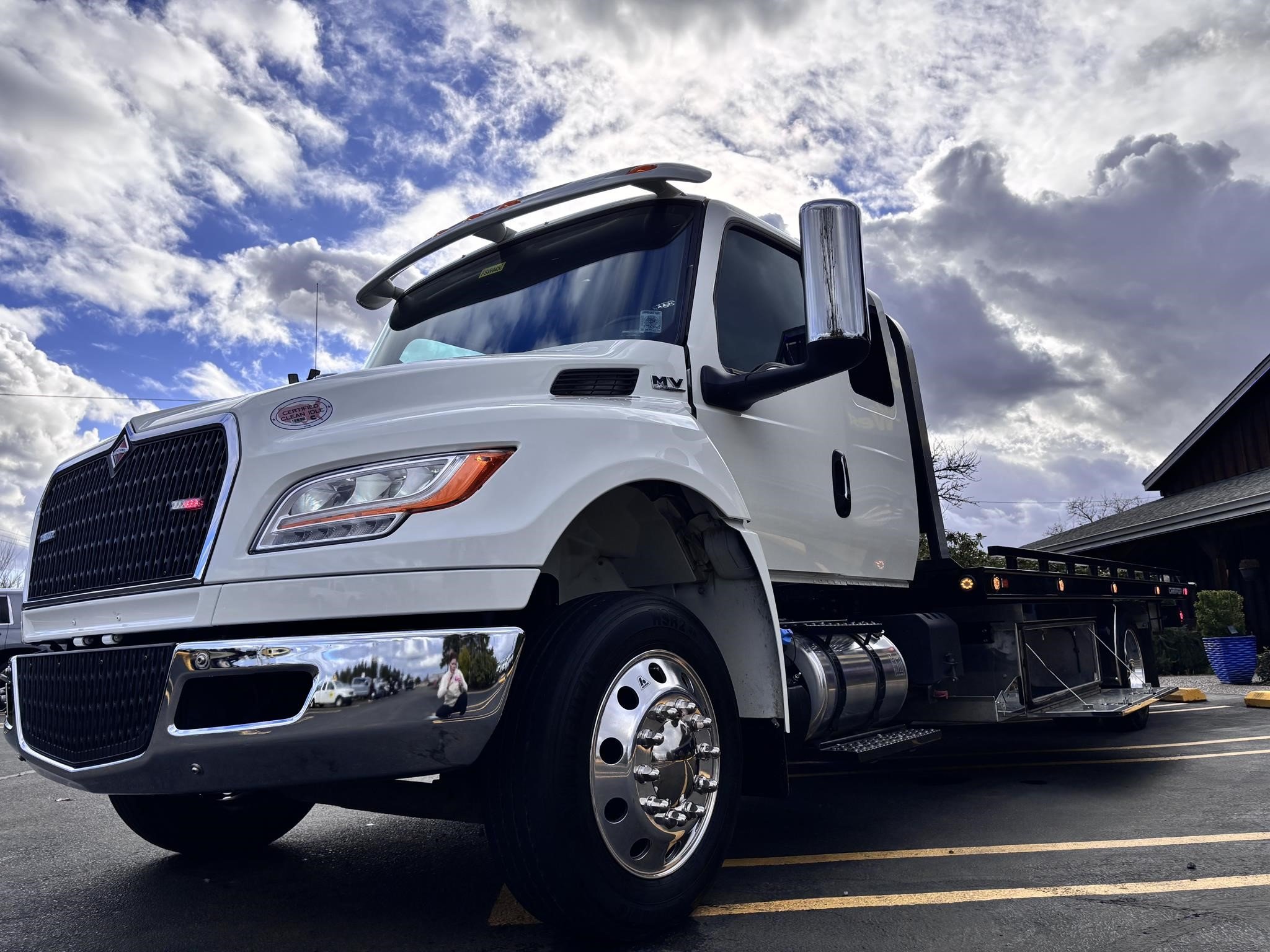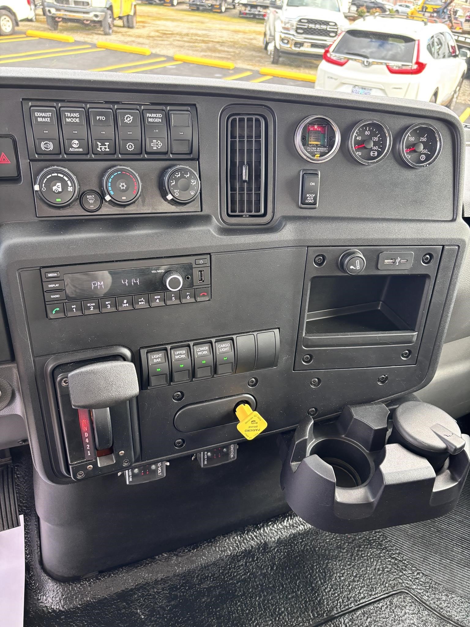2025 International Model MV Extended cab. Cummins ISB 6.7L, 260HP @ 2,300 rpm, 660 lb-ft @ 1,600 rpm, Allison RDS-2200 6 Speed Auto, Air Brakes, Air Dryer Heater, Exhaust Brake, Front Axle: Dana-Spicer I-Beam 8,000lb w/ Shock Absorbers, Rear Axle: Dana-Spicer 17,500lb, 20,000lb Air Ride Suspension, 4.88 Rear Axle Ratio, Chrome Bumper, black Grille, Air Ride Driver Seat, Air ride Passenger Seat, rear bench seat. Idle Up, Cruise Control, Tilt-Wheel, AM/FM/CD/MP3 w/ Bluetooth, Air Horn, Engine Block Heater, Dual 40-50 Gal Alum Fuel Tanks, 7 Gal DEF Tank, Power Windows, Power Door Locks, Power heated Mirrors. A/C, 255/70R22.5 Tires w/ 22.5 Alum Wheels, Cup holders.Visor 25,500 GVWR,
