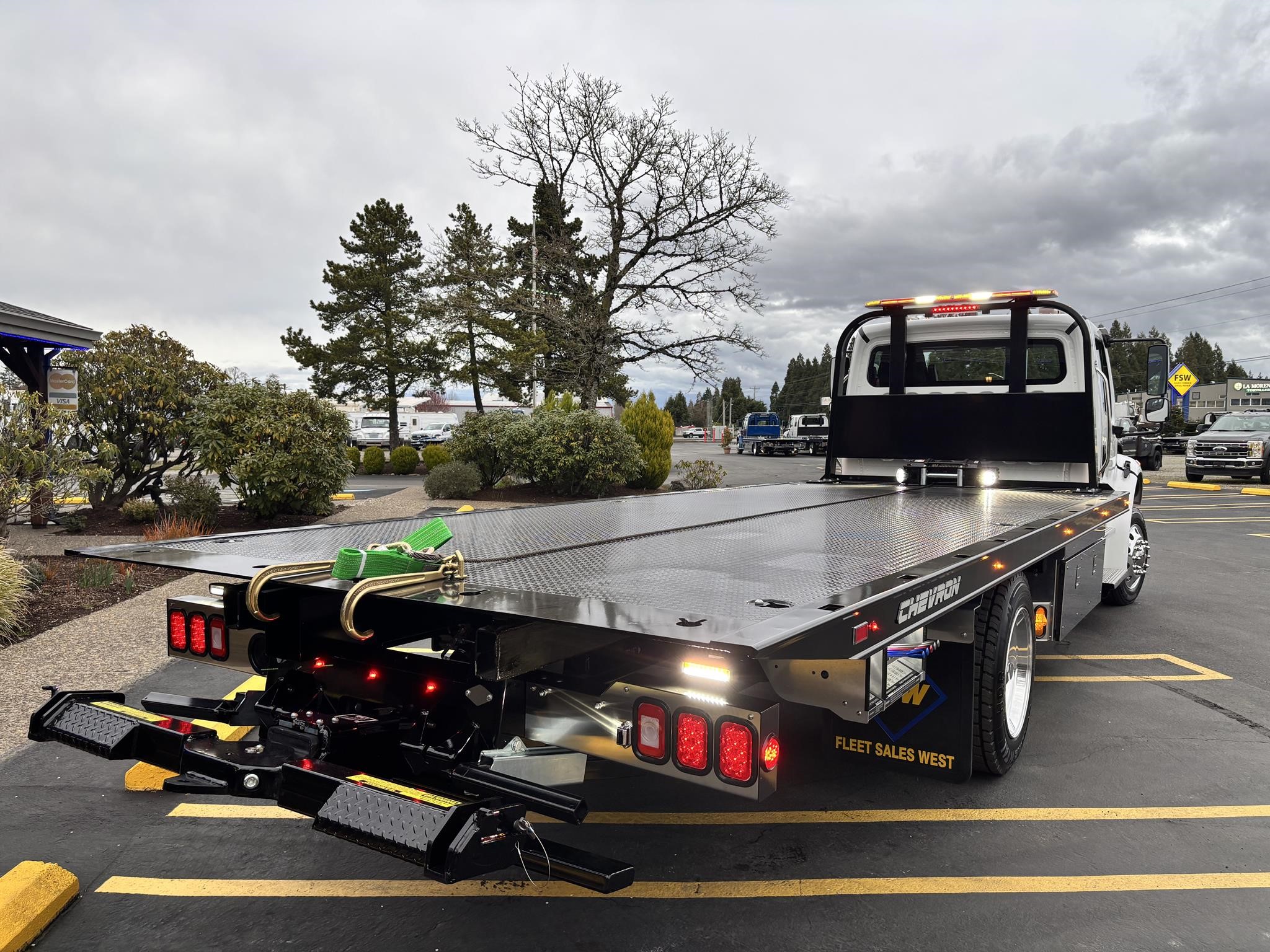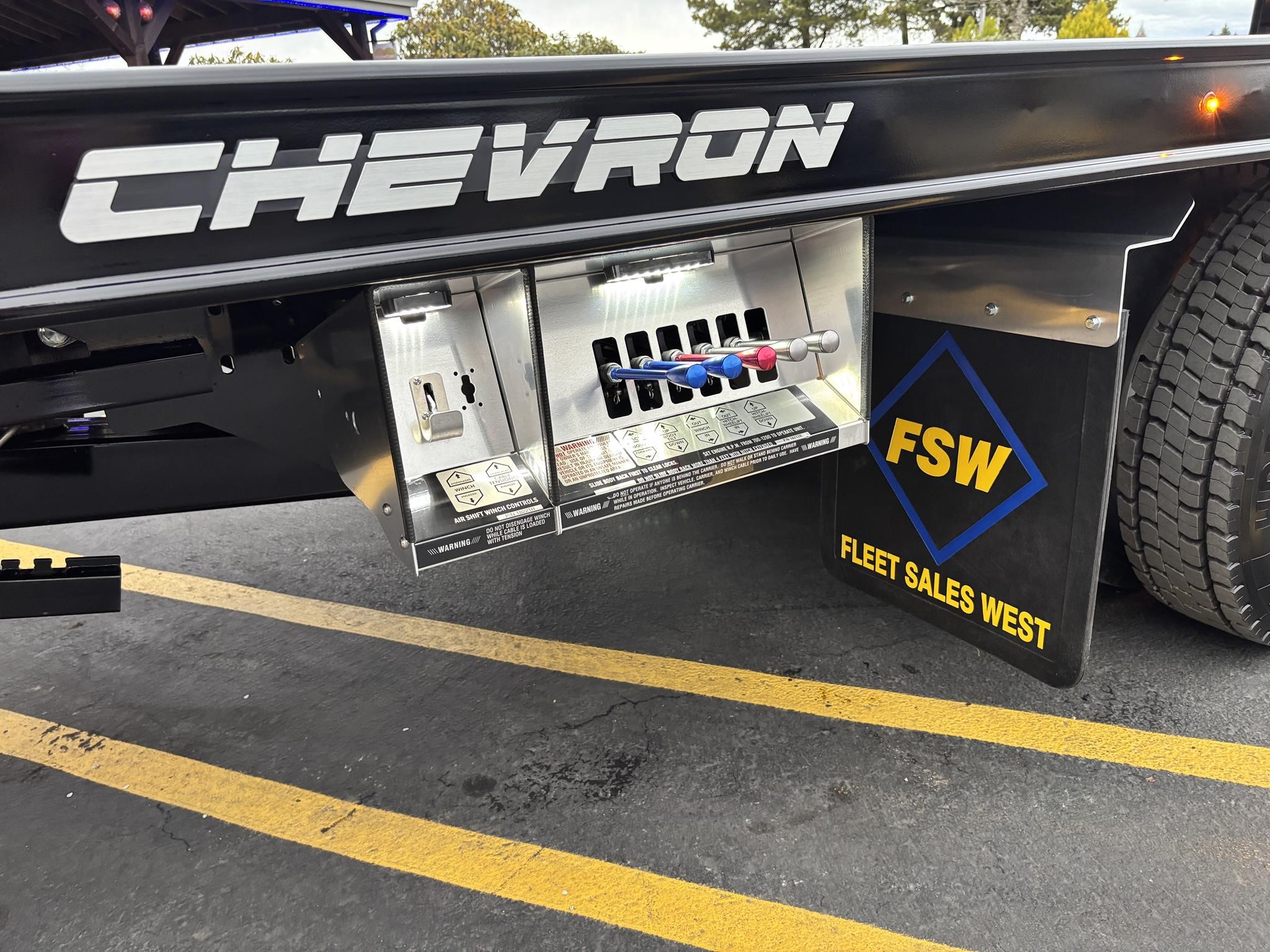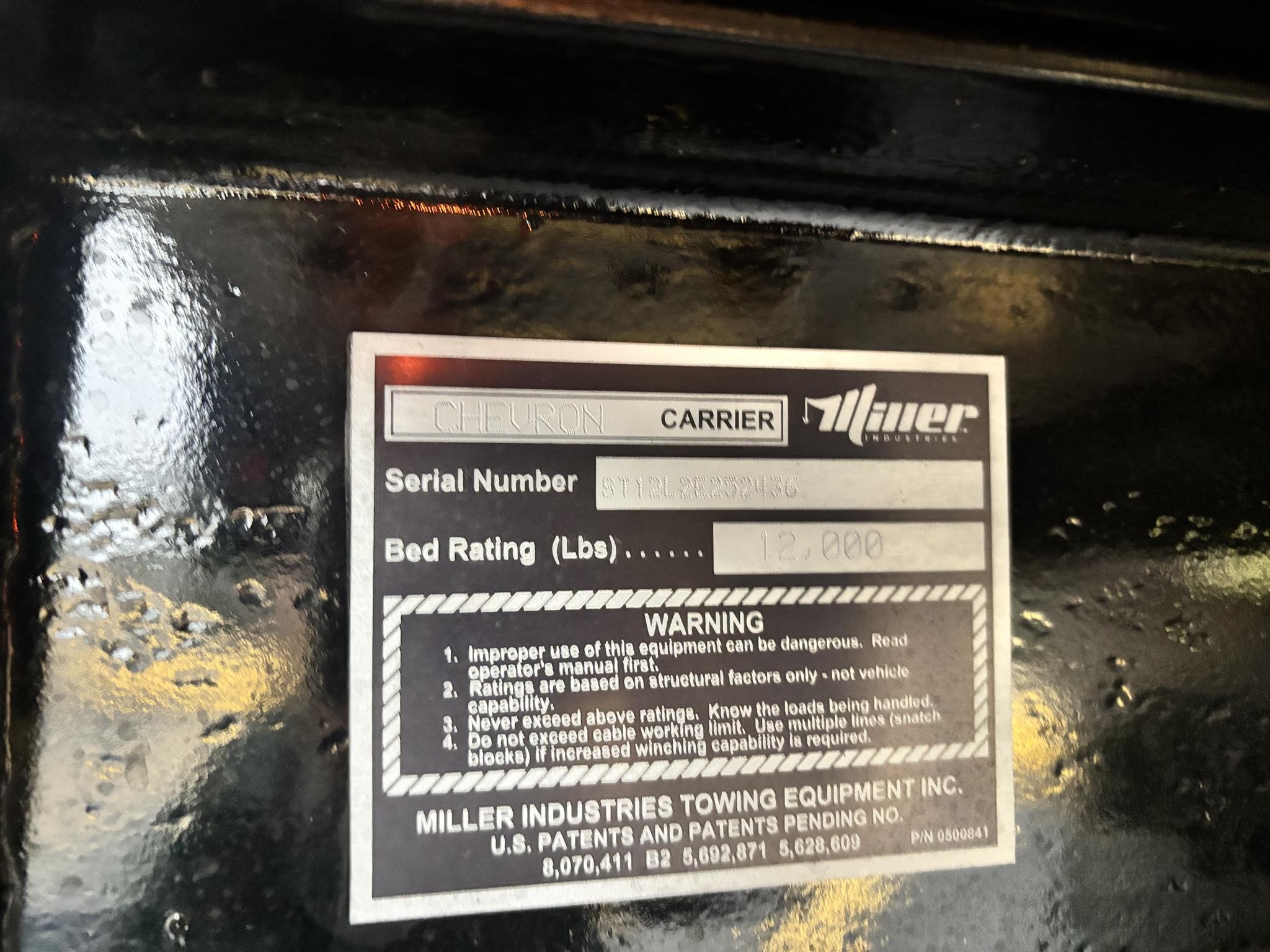 Chevron 21' Steel LCG (Low Center of Gravity) Carrier w/ Wheel Lift, 3/16 Deck Plate, 3x2 Corten Tube Crossmembers on 8 inch Centers, (4) Rear Chain Locks, (2) Front Chain Locks, (6) Floor Plate Chain Locks (3 per side), 8,000lb Worm Gear Winch, 3/8" x 50' Winch Cable, Illuminated Dual Controls, FMVSS 108 Lamp Group Shock Mounted Lighted, Direct Mount Pump, Cable Roller Guide w/ Tensioner, Winch Free Spool Extension, Back-Up Alarm, (2) Safety Chains, Mechanical Anti-tilt, Black Body Paint, 102" Wide Body, Inboard Tilt Cylinders, Floor Level Roll Formed w/ Punched Stake Pockets, 4,000lb Wheel Lift w/ Releasable L Arms, Fully Hydraulic Wheel Lift, (2) Safety Straps & Ratchets, (2) Rear Safety Chains, Body Lock w/ Nylatron Roller Bearings, & 12,000lb Deck Load Rating. Body Serial# ST12L2E252436