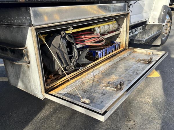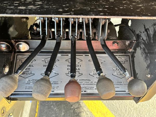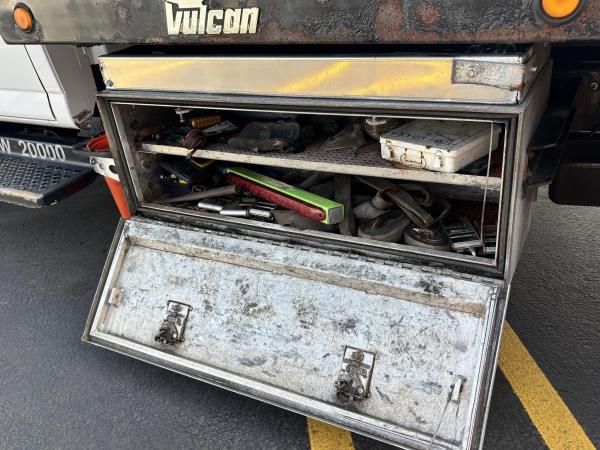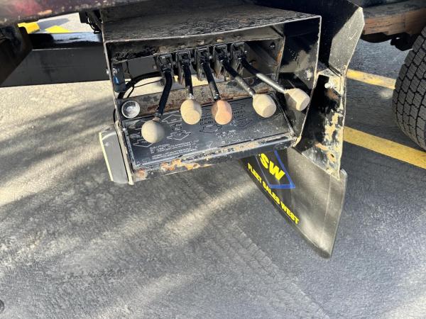 Power steering leak. Steering gear box input shaft seal is leaking., There are several in-op lights on the bed and tailboard with poor wiring hanging out. It has a four-headlight system on the hood. The low beams work okay. But only the outer headlight high beams are working. The winch release handle lever on the winch housing is loose on the cross shaft. But it is working., A/C is in-op. Steering draglink has a loose ball joint. The air compressor under the driver side of the cab is unplugged, and the driver seat has an airbag, but the seat is being held up with a piece of wood. Park brake adjuster knob has come off the brake handle. The brake is working. There is a brake warning light on in the dashboard display. Not sure if it’s related to the hand brake or the braking system itself.